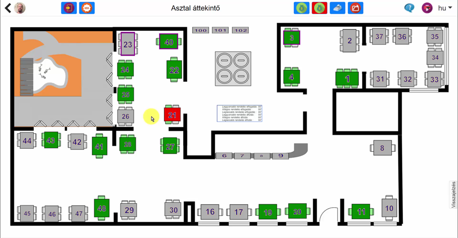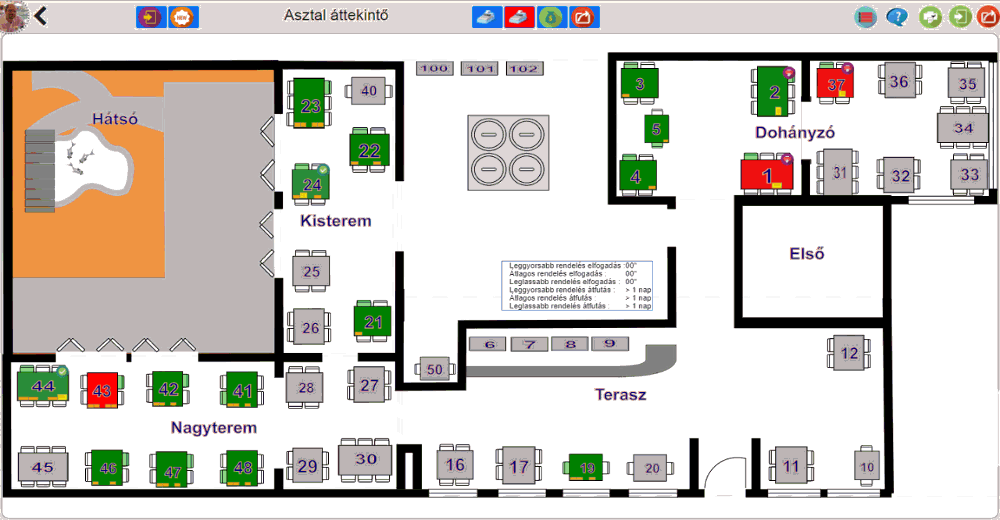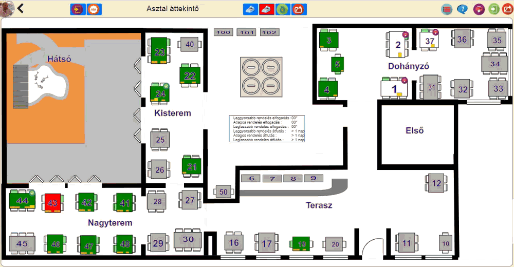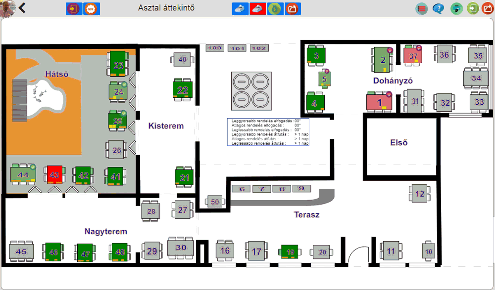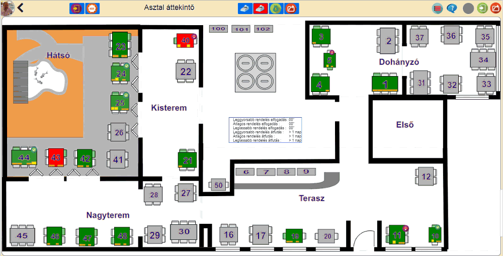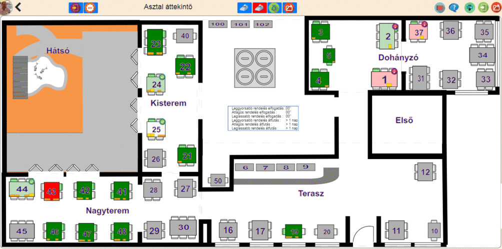 A különböző színkódok, ikonok mind az asztalok állapotáról adnak információt, így az asztal megnyitása nélkül is sok információ áll rendelkezésre.