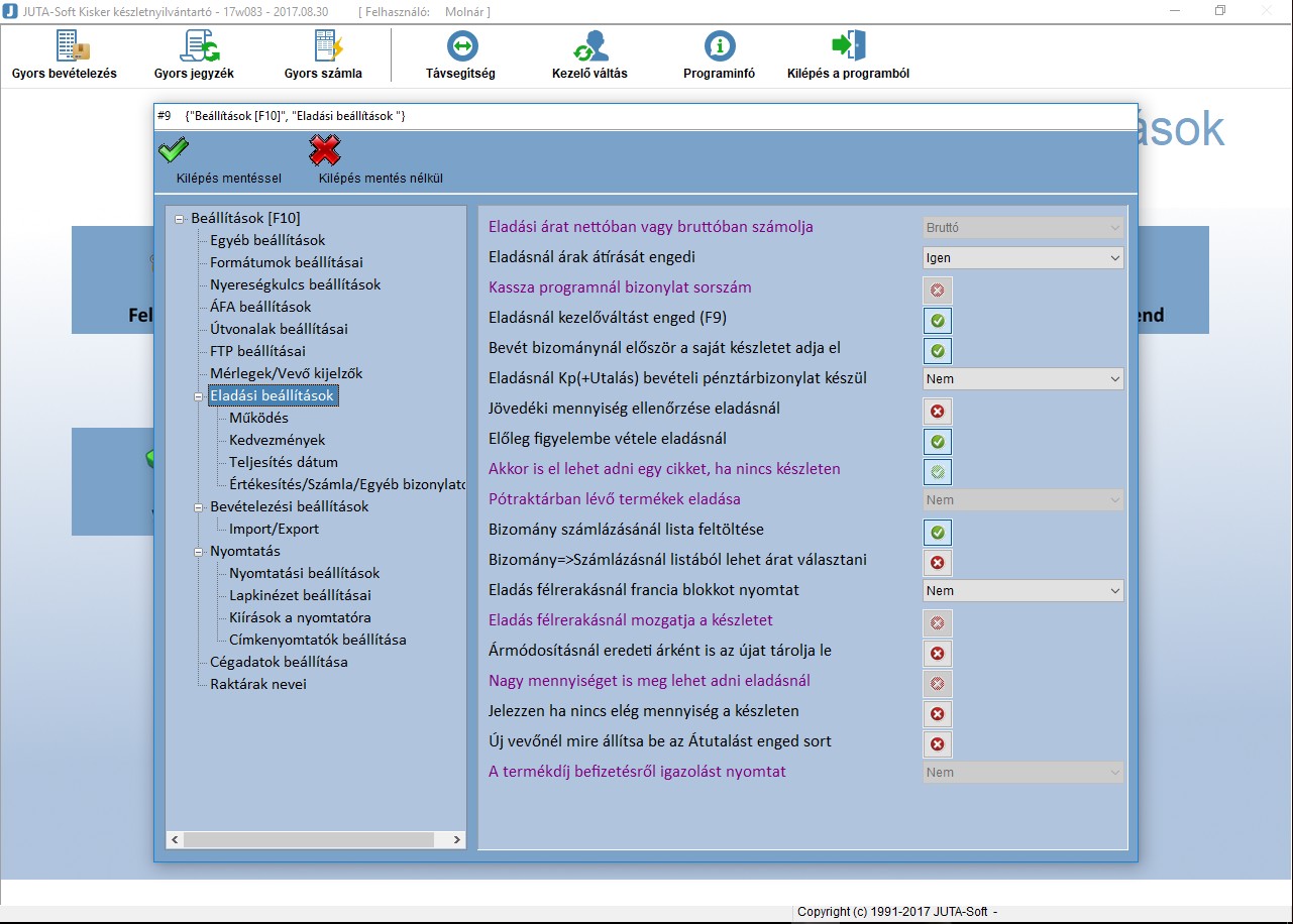 A Juta-Soft Kft. által forgalmazott JUTA-Kisker raktárkészlet nyilvántartó és számlázó program megfelel a 23/2014. (VI. 30.) NGM rendeletben előírtaknak és a 47/2007. (XII. 29.) PM rendelettel módosított 24/1995. (XI. 22.) PM rendeletben, valamint a 2007. évi CXXVII. törvényben előírtaknak, mely szerint a számítógéppel előállított számla, amelynek szigorú számadás alá vonása megvalósul oly módon, hogy a gépi program kihagyás és ismétlés nélkül biztosítja a sorszámozást, és a másolatok alapján a hiánytalan elszámolás biztosított. A számlázó program a számla sorszámokat automatikusan generálja, azokat utólag módosítani nem lehet, a megírt számlák nem módosíthatók, továbbá a 2016. január 1-jétől hatályos 11/A. § értelm ében a számlázó program olyan önálló, de a programba beépített, „adóhatósági ellenőrzési adatszolgáltatás” elnevezésű funkcióval rendelkezik, amelynek elindításával adatexport végezhető. Ez a funkció a programban NAV adatszolgáltatás menüpont alatt található.